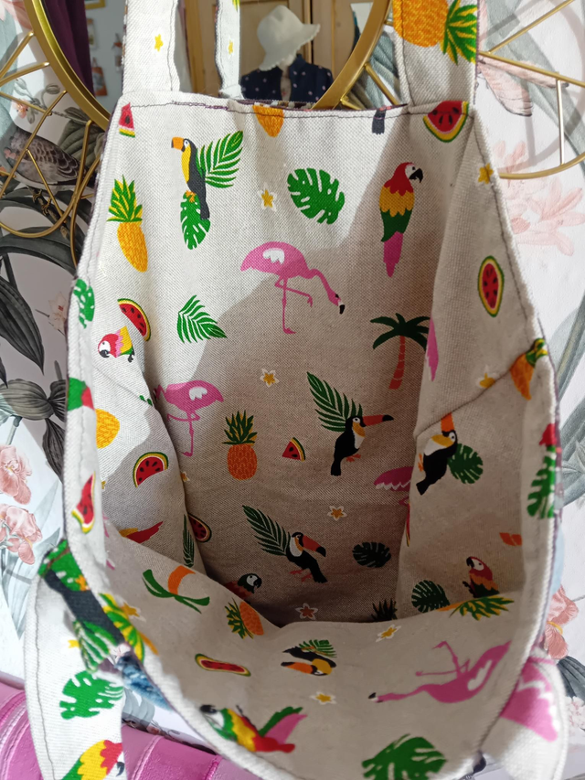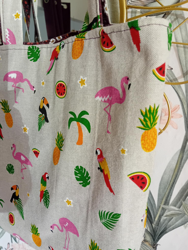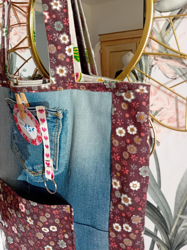 Sac tote-bag reversible, imprimé oiseaux, et tissu jeans recyclé, velours marron fleurs.